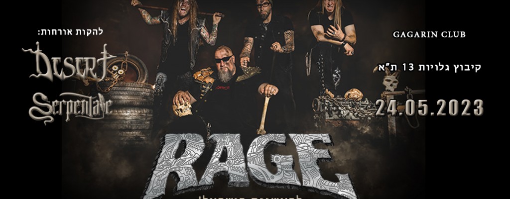 RAGE - אגדת הבי/פאור מטאל מגרמניה תגיע להופעה אחד בישראל ותופיע ב-24.05.23 במועדון "גאגארין", תל אביבהלהקה אורחת - DESERT.100 כרטיסים הראשונים -במחיר מוזל של 220 ש"חRAGE נחשבת לאחד המייסדות של סצנת הבי/ספיד/ פאור מטאל הגרמנית ושייכת לרביעית הענקיות בתחום יחד עםHELLOWEEN, RUNNING WILD ו-GRAVE DIGGERהלהקה קיימת משנת 1983 והוציאה עד היום 26 אלבומי האולפן. המוזיקה של ההרכב משלבת הבי/פאור מטאל מסורתי עם נגיות של טראש, ספיד וסימפוניק מטאל הלהקה הוקמה ע"י הבסיסת/זמר Peter "Peavy" Wagner ולעורך השנים ניגנו בה מוזיקאים ענקיים כמוMannie Schmidt, Victor Smolski, Mike Terrana והרבה אחריםהלהקה תגיע לארץ בפעם הראשונה עם הופעה החגיגית לכבוד 40 שנות הפעילות ומכינה אירוע בלתי נשכח שתכלול את הלהיטים הבולטים של ההרכב יחד עם השירים מאלבום החדש Resurrection Day שיצאה לפני שנה הלהקות האורחות הן DESERT - מכונת המטאל מלודי וותיקי סצינה שתופיע במסגרת סיבוב ההופעות לכבוד 20 שנות פעילות ההרכב ו-SERPENTALE - הרכב מטאל מלודי העולה ומאוד מבטיח אשר חוגג שחרור ה-EP הבכורה וכובש במות בארץ.