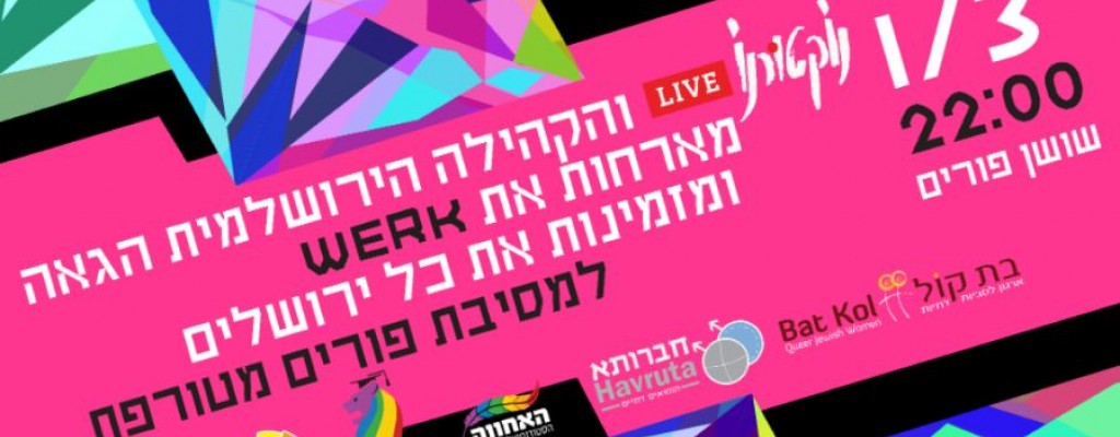 חוגגים פורים בנוקטורנו Live עם הקהילה הירושלמית הגאה וליין ה Werk התלאביבי המקפיץ! בשיתוף, האחווה הירושלמית הגאה, הבית הפתוח, בת קול וחברותא. ומזמינים את כל ירושלים לחגוג איתנו במסיבה משוגעת!